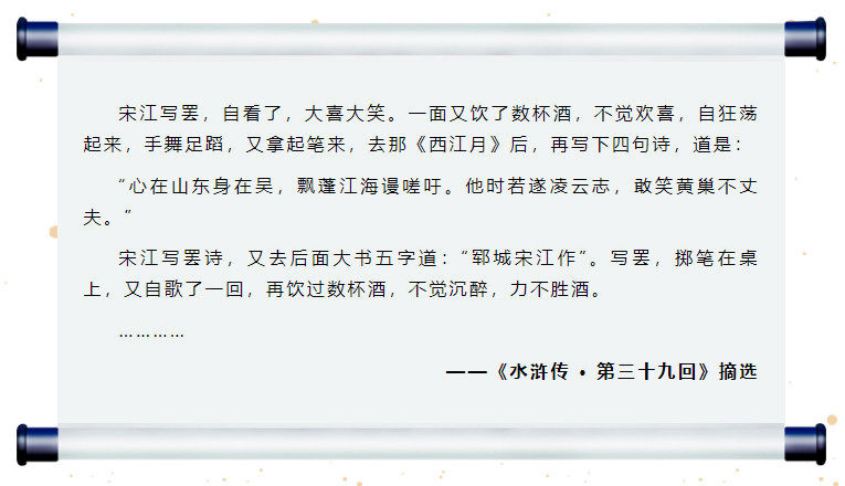 《水滸傳》第39回,宋江因殺閻婆惜而被流放江州,某天獨自一人在潯陽樓上喝悶酒,酒過三巡,臨江而望,想到自己一腔抱負卻施展無門,不由感恨傷懷。