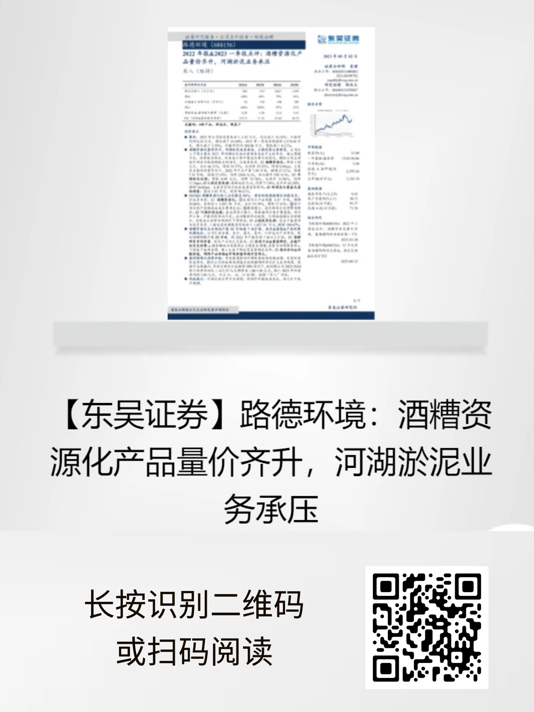【點評報告】東吳證券點評路德環境:酒糟資源化產品量價齊升,河湖淤泥業務承壓