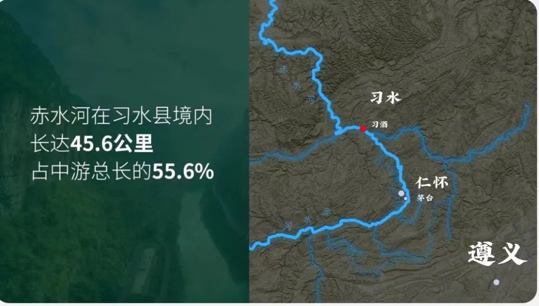 在習水縣境內,赤水河長達45.6公里,占中游總長的55.6%,地處赤水河流域優質醬酒核心腹地的區位優勢,為習水產區的強勢崛起打下了堅實的基礎。