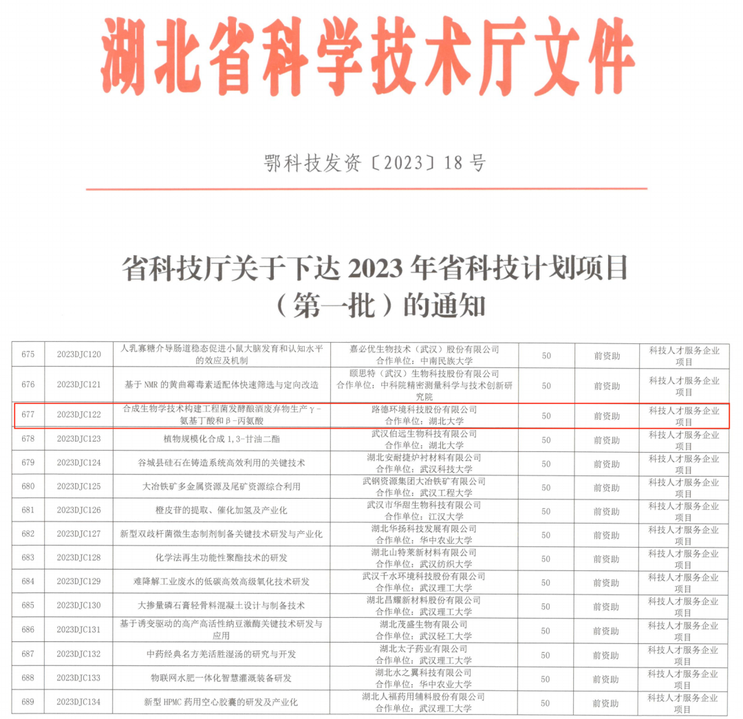 近日,湖北省科技廳公布了2023年省科技計劃立項項目(第一批)清單,其中,路德環境“合成生物學技術構建工程菌發酵釀酒廢棄物生產γ-氨基丁酸和β-丙氨酸”科研項目,成功入選“科技人才服務企業項目”,獲得50萬元的科研經費。