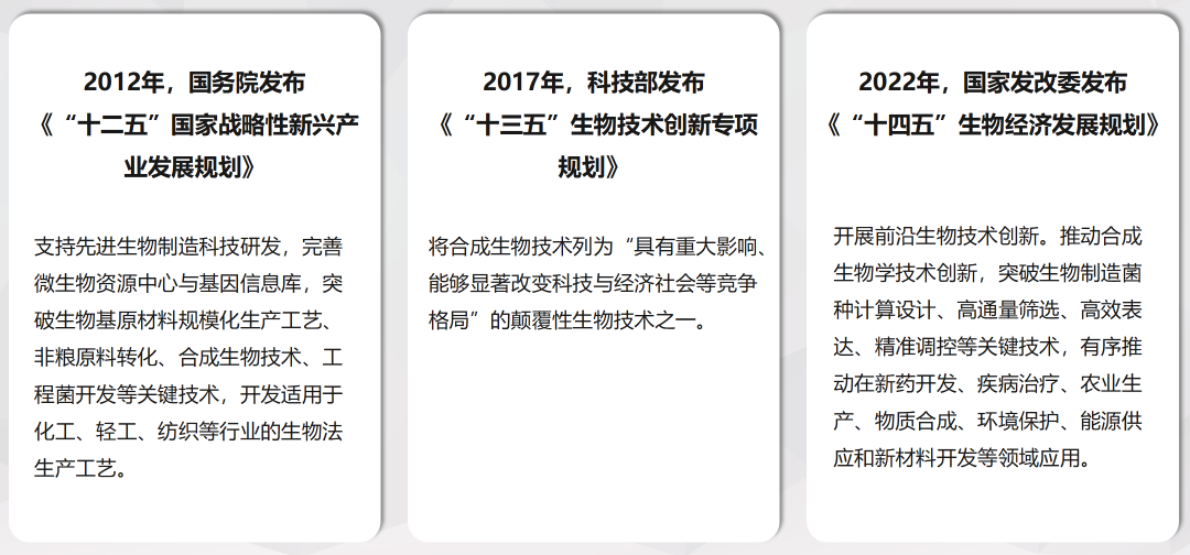 在我國,從“十二五”國家提出支持先進生物制造科技研發,到“十三五”國家將合成生物技術列為引領產業變革的顛覆性技術之一,再到“十四五”明確表示“要有序推動合成生物技術在新藥開發、疾病治療、農業生產、物質合成、環境保護、能源供應和新材料開發等領域應用”,一直以來,隨著國家持續出臺政策予以大力支持,我國合成生物產業擁有廣闊的發展前景。