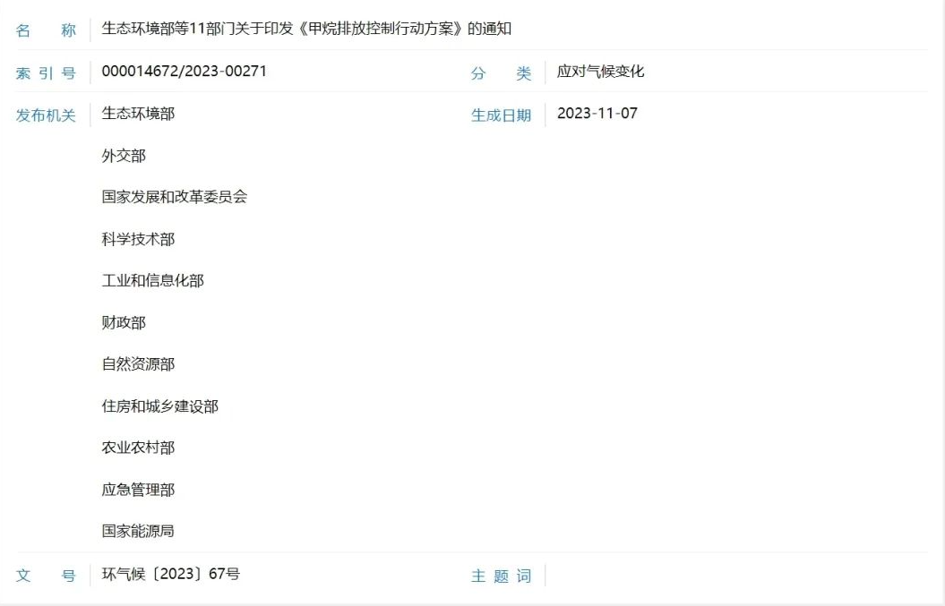 11月7日,生態環境部等11部門聯合印發《甲烷排放控制行動方案》的通知,這是我國開展甲烷排放管理控制的頂層設計文件,明確提出了“十四五”和“十五五”期間甲烷排放控制目標。