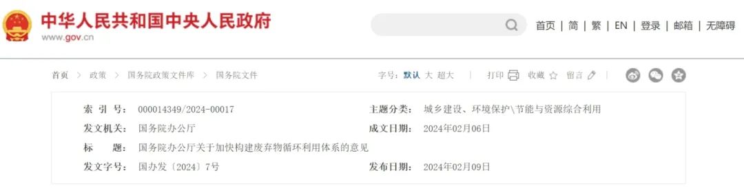 春節(jié)前夕,國務(wù)院辦公廳發(fā)布《關(guān)于加快構(gòu)建廢棄物循環(huán)利用體系的意見(點(diǎn)擊閱讀政策原文)》(國辦發(fā)〔2024〕7號(hào),以下簡(jiǎn)稱《意見》)。