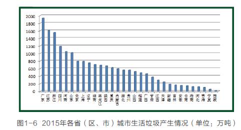 2016年,全國共有246個(gè)大、中城市向社會發(fā)布了2015年固體廢物污染環(huán)境防治信息。其中,應(yīng)開展信息發(fā)布工作的47個(gè)環(huán)境保護(hù)重點(diǎn)城市和56個(gè)環(huán)境保護(hù)模范城市均已按照規(guī)定發(fā)布信息,另外還有143個(gè)城市自愿開展了信息發(fā)布工作(詳見附表一)。經(jīng)統(tǒng)計(jì),此次發(fā)布信息的大、中城市一般工業(yè)固體廢物產(chǎn)生量為19.1億噸,工業(yè)危險(xiǎn)廢物產(chǎn)生量為2801.8萬噸,醫(yī)療廢物產(chǎn)生量約為68.9萬噸,生活垃圾產(chǎn)生量約為18564.0萬噸。2015年,246個(gè)大、中城市生活垃圾產(chǎn)生量18564.0萬噸,處置量18069.5萬噸,處置率達(dá)97.3%。各省(區(qū)、市)發(fā)布的大、中城市生活垃圾產(chǎn)生情況見下圖。