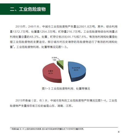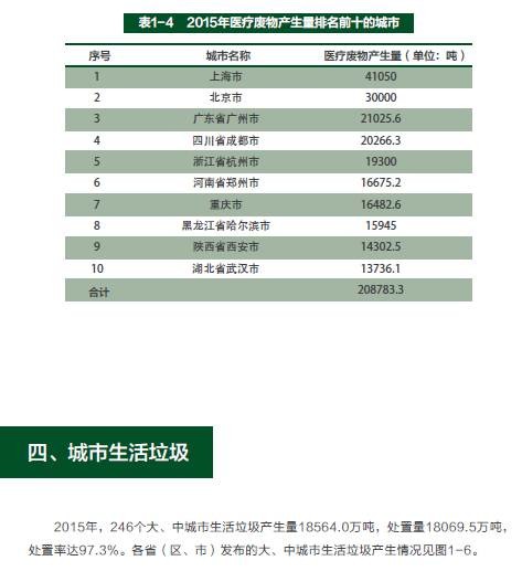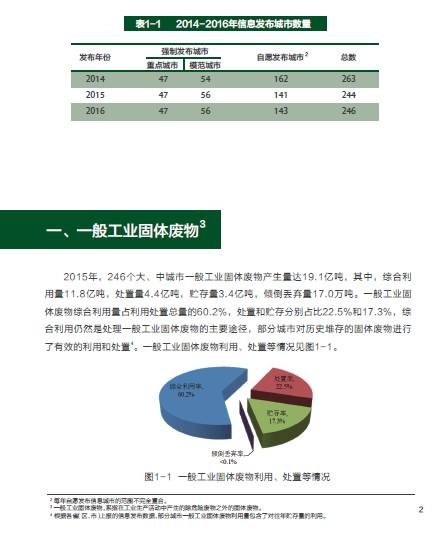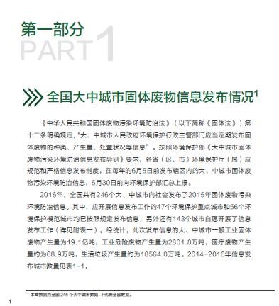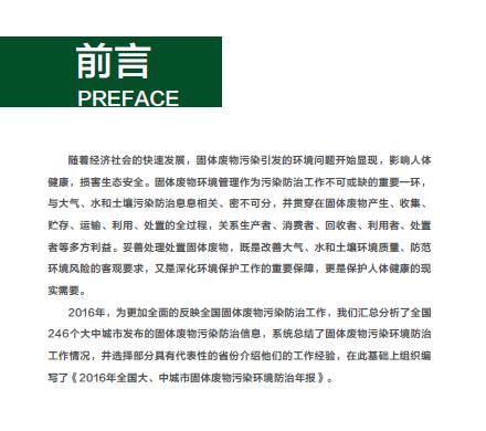 環(huán)保部發(fā)布《2016年全國大、中城市固體廢物污染環(huán)境防治年報(bào)年報(bào)》,匯總分析了全國246個(gè)大中城市發(fā)布的固體廢物污染防治信息,系統(tǒng)總結(jié)了固體廢物污染環(huán)境防治工作情況,并選擇部分具有代表性的省份介紹他們的工作經(jīng)驗(yàn)。