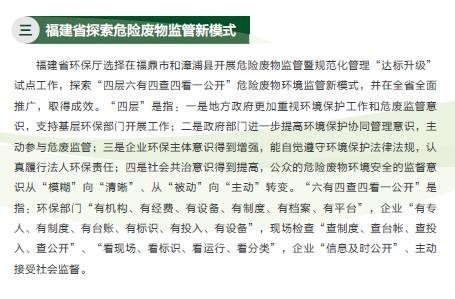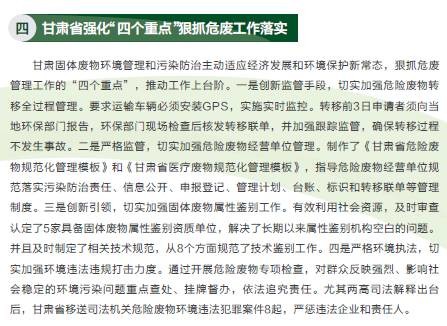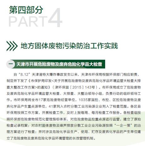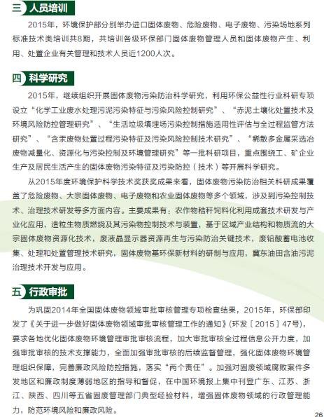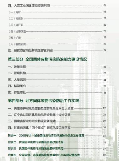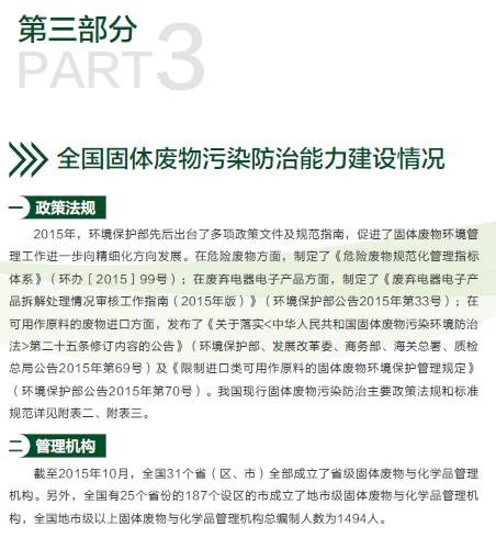 《年報(bào)》還介紹了我國現(xiàn)行固體廢物污染防治主要政策法規(guī)、固體廢物管理機(jī)構(gòu)能力建設(shè)情況、固體廢物管理技術(shù)培訓(xùn)情況以及固體廢物污染防治相關(guān)科研成果。并選擇4個(gè)代表性省份,介紹了他們在解決固體廢物管理重點(diǎn)、難點(diǎn)問題方面的經(jīng)驗(yàn)和做法。