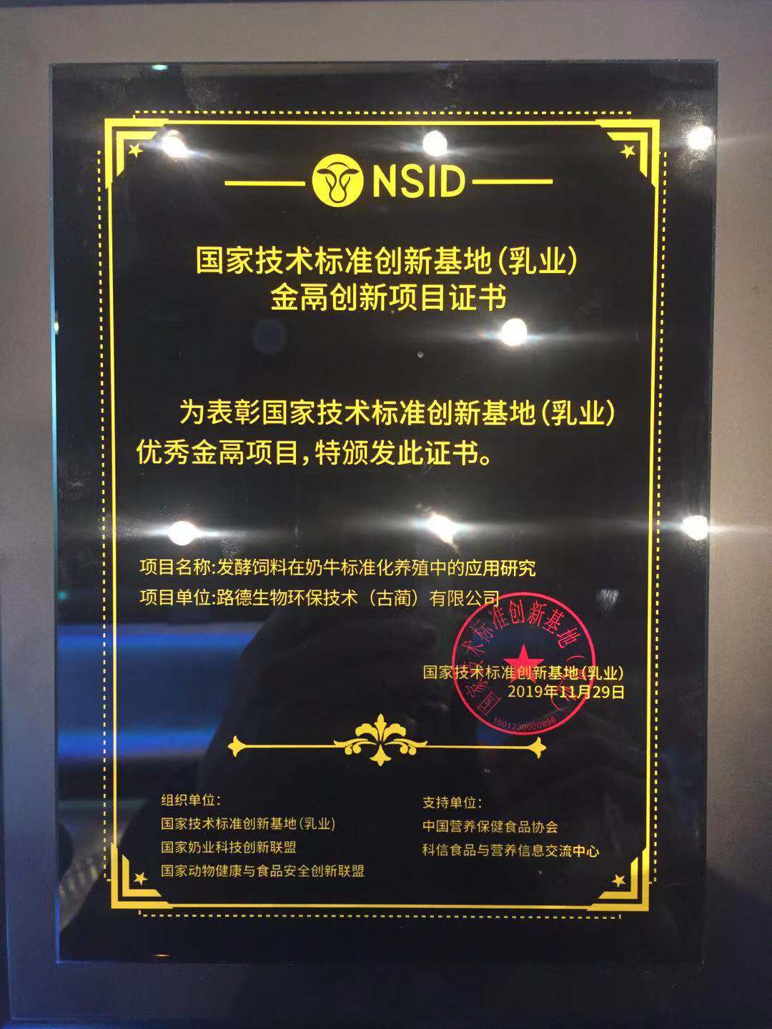 熱烈祝賀路德生物環(huán)保技術(古藺)有限公司創(chuàng)新項目“發(fā)酵飼料在奶牛標準化養(yǎng)殖中的應用研究”榮獲國家技術標準創(chuàng)新基地(乳業(yè))金鬲創(chuàng)新項目證書。